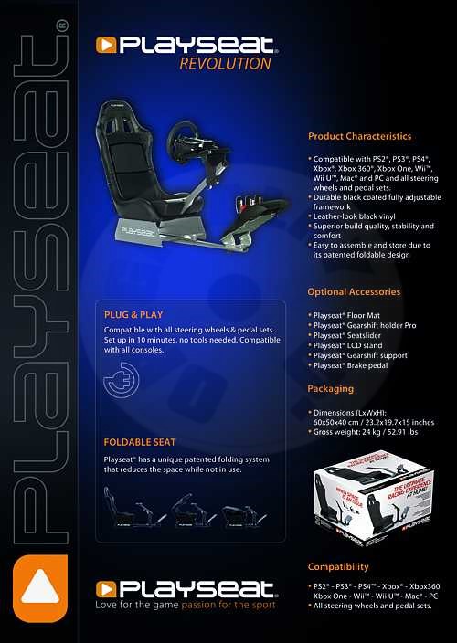 Z řady Evolution si Revolution vzal lesklý kožený povrch a příznivou cenu, z řady WRC/GT/Forza zase lepší plně polohovatelnou konstrukci. Kromě nastavitených pedálů tak jde nyní i pohodlně posunovat se stolkem pro volant a řadící páku.